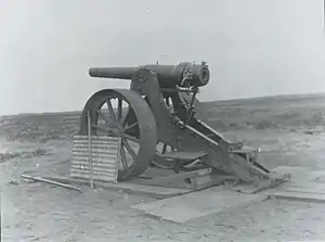 In September 1876 trials with the 15 cm zwaar staal and 12 cm Lang staal were held at the Krupp trial grounds. The results were very positive.[9] Meanwhile, comparative trials in the Netherlands between the 8 cm A. Brons and the Krupp 8,7 mm steel breechloader led the artillery committee to recommend steel field guns.[10] In light of the trials at the Krupp grounds, the Minister of War then decided to contract with Krupp. However, for the money that was voted on the 1876 budget, he bought less 15 cm zwaar staal guns and more 12 cm Lang staal guns.[9] The House of Representatives was not amused, and wanted to know how many guns had been bought at Krupp for which price.[11] In December 1876 the minister replied that the state had 20 15 cm zwaar staal guns and 60 12 cm Lang staal guns on order at Krupp. The 12 cm Lang staal gun would cost 7,980 mark, same price as before.[12] For 1877 the Minister of War then asked money for 100 12 cm Lang staal.[11]