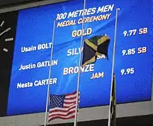 - ↑ "Usain Bolt runs 9.77 seconds to win world 100m title in Moscow". BBC Sport. 11 August 2013. Retrieved 12 August 2013.