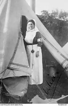 ![]() Sister Alice Cashin, in front of a tent in the grounds of a British General Hospital in Calais, France, c. 1915 | |