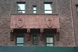 On the ground floor of the building, the façade has a raised granite base with stone-trimmed doorways and windows. The main entrance is topped by a lintel with molded denticulation; it is decorated with an eagle, wreath, and ribbons above the doorway, which serve as a tribute to the American entry into World War I. Arched windows and secondary doorways are located on either side of the main entrance, each of which has a molded lintel. The façade facing the street consists of three recessed window bays and is made of red brick highlighted by red terra cotta elements above the windows on the second floor that include cartouches, a blind arcade band on the center bay, and balconettes supported by decorative brackets on the outer bays. Other terra cotta elements include blind arcade bands and cartouches on some of the upper floors and a colonnade and arcade on the façade at the roof garden. The building's terra cotta elements were fabricated by the Atlantic Terra Cotta Company.[45]