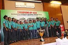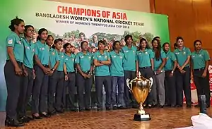 The Bangladesh women's national cricket team (Bengali: বাংলাদেশ জাতীয় মহিলা ক্রিকেট দল) is the team that represents the country of Bangladesh in international women's cricket matches. They made their international debut when they played, and won, two matches against Thailand in July 2007[8] before participating in and winning the 2007 ACC Women's Tournament.[9] Bangladesh were granted One-Day International (ODI) status in 2011 after finishing fifth in the 2011 Women's Cricket World Cup Qualifier. They subsequently qualified for the 2014 ICC Women's World Twenty20 as hosts, making their first appearance at a top-level women's international tournament. They have also won the 2018 edition of ACC Women's Asia Cup. This was the only instance in ACC Women's Asia Cup where any team other than India won the tournament. However, they finished fifth in the next edition (2022 edition) of Women's Asia Cup, but has since went on to become one of the most competitive women's cricket teams in Asia. The team made its first World Cup appearance at the 2022 Women's Cricket World Cup, and has participated in every edition of the World Twenty20 since making its debut at the 2014 edition.
