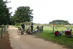 From Anderson to Kilcunda the trail drops 40 metres (130 ft) in height as it winds down through farming country. Here, the gravel path is overgrown and trail users need to negotiate several gates. The rail trail at Kilcunda is built on the coastal sand dunes and incorporates a landmark trestle bridge over Bourne Creek. Path users have panoramic scenic views of the Bass Strait coast and the Wonthaggi Wind Farm that was erected during 2005.