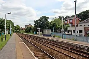 The station is unstaffed and has no ticketing provision, so these must be purchased on the train or in advance of travel. There are waiting shelters on both platforms - the one on the southbound side is of brick construction and uses a design unique to this particular route.[8] The only other amenities provided are CIS displays and timetable poster boards on each side and a bike stand on platform 1 (the former building on the northbound side was demolished after the station became unstaffed in 1969). No step-free access is available to either platform.[9]