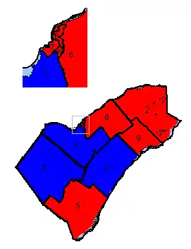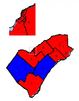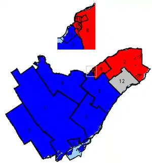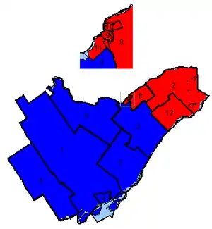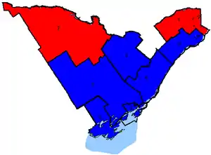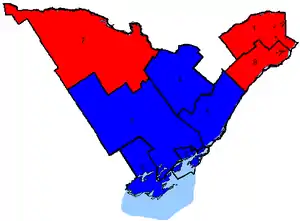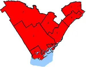 ![]() Map of the region's ridings in 1958. Colours show the result from the 1958 election |