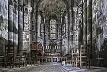 By 1882, with the arrival of the pyramid-like spire, the project had come close to completion. It was a cruciform layout, typical of larger Gothic structures in Europe, but a third the size of the original Seminary Church.[1]
