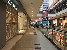 The shopping centre consists of three floors with over 110 businesses, cafés and restaurants with a total shopping area of 30 thousand square metres.[1] There are about 880 for-pay parking spaces on two floors. Two prevent traffic congestion, St. Veiter Ring was widened to four lanes in the area around City-Arkaden. Directly in front of the main entrance is the bus stop "Heuplatz" where the Klagenfurt city buses 40 and 41 stop every 7 to 15 minutes in directions of the Klagenfurt railway station, Annabichl and Feschnig.