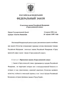 - 1 2 Президент Российской Федерации. Федеральный закон №68-ФЗ от 9 мая 2006 года «О почётном звании Российской Федерации „Город воинской славы“». (The President of the Russian Federation. Federal Law #68-FZ of May 9, 2006 On the Honorary Title of the Russian Federation “City of Military Glory”. ).