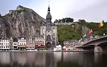 The Collegiate Church of Our Lady of Dinant (French: Collégiale Notre-Dame de Dinant) is a Roman Catholic collegiate church located in Dinant, a city in Wallonia (southern Belgium), on the banks of the river Meuse. The 13th-century Gothic building replaced a 10th-century Romanesque church which collapsed in 1228, leaving only the north door. Its most iconic part is the separate 16th-century pear-shaped bell tower.[1]