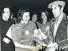 ![]() Schiavo (left), captain of the women's national team, being given an award by Adriano Celentano in 1974 | |||