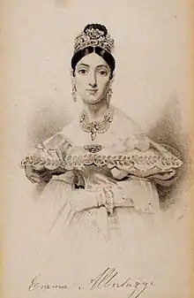 Emma Albertazzi (née Howson; 1 May 1815 – 25 September 1847) was an English operatic contralto.[1] She began her opera career in Italy, France and Spain, making her British debut in 1837. Critics praised the beauty of her voice but found her acting too "ladylike" and lacking energy. She also sang prolifically on the concert stage. After giving birth to her fifth child, she returned briefly to singing, but died only months later at the age of 32.