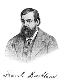 Frank was the first son of Canon William Buckland, a noted geologist and palaeontologist, and Mary, a fossil collector, palaeontologist and illustrator. Frank was born and brought up in Oxford, where his father was a Canon of Christ Church. His godfather was the sculptor Sir Francis Chantrey. Educated at home by his mother, he went, at eight and a half, to a boarding school in Cotterstock, Northamptonshire staying with his uncle John Buckland. From 1837 to 1839, he went to a preparatory school in Laleham, Surrey, run by his uncle, John Buckland,[1] a brutal headmaster who flogged his pupils quite excessively.[2] Relief came with a scholarship to Winchester College, a school with an unbroken history of six hundred years. Here he was taught by the Second Master, Charles Wordsworth, who sent letters of praise to his father. Winchester had a harsh regime, but was much preferable to his previous school. While at Winchester he continued to take an interest in animals, trapping rats and mice, dissecting and sometimes eating them.[3] Students complained of a foul smell emanating from the remains of a cat under his bed. Towards the end of his schooling, he was dissecting human parts that he obtained from the hospital on the sly. He was known for his exploits with a lancet. One student with a dolichocephalous head heard Frank muttering "what wouldn't I give for that fellow's skull!"[4] He was not a first-rate scholar, but managed to gain entrance to Christ Church, Oxford in October 1844,[5] after failing to get a scholarship to the smaller Corpus Christi.[6] He joined a debating club and the first essay he read was on "whether Rooks are beneficial to the farmer or not".[7] He became a friend of the curator at Surrey Zoo and when he heard that a panther had died, he had it dug up and declared that the meat "was not very good".[8] When the British Association met in 1847 at Oxford, Frank took along his pet bear Tigleth Pileser dressed in student attire of a cap and gown to the party. Charles Lyell wrote that Buckland introduced the bear formally to him and other zoologists present. This was not to go on for long as the Dean finally informed him that "either you or your bear must go".[9] In 1845 Frank went to Giessen for three months to study chemistry under Justus von Liebig.[10] In September 1846 he made a trip around Switzerland.[11] Frank also attended some of the lectures of his father.[12]