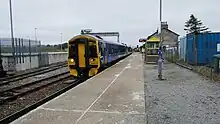 Georgemas Junction station has been used for several freight services. In the early 2000s, EWS operated a freight train for Safeway supermarket, running from Mossend to Georgemas. Containers were unloaded at Georgemas, then transported by road to Wick and Thurso, and by ferry to Orkney.[10] In 2012, the former platform 1 and the footbridge was removed when Direct Rail Services constructed a new freight terminal at Georgemas - this has been used by trains taking nuclear material from Dounreay to Sellafield.[11] As this platform was located on a passing loop which did not connect directly to the Thurso branch, it was very little-used by passenger trains, since all services through the station run to or from Thurso.[12] The purpose of the passing loop dates back to the era of loco-hauled trains which divided/attached at the station – an Inverness-bound train from Wick would loop around the Thurso portion standing on the second (remaining) platform, and attach to it from behind.