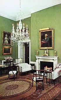 ![]() The Green Room, in an undated photo, likely created between 1860 and 1880, and then used as a Presidential study. | |