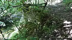 As stated, between 1812 and 1815 seventy or so Napoleonic War army and navy officers were billeted in Sanquhar Burgh.[12] These prisoners had a great deal of freedom and often visited the Crawick Water to swim and walk in the woods. Overlooking the glen near Sarah's Trough is a large and flat faced vertical rock that is covered in graffiti left by the prisoners and other visitors.[10] Much of it is now hard to read, although the words 'Luogo di Delizia'[13] are still discernable,[9] being in the Italian language and meaning 'delightful place'.[14] The dates 1812 and 1814 are visible,[15] a possible coat of arms, some well-carved initials and the French word 'Souvenir' that can mean 'memory, remembrance, recollection, keepsake or memento'.[10]