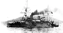 Armament was heavy for her size, with the main battery consisting of a pair of 10-inch (254 mm) 30-caliber breech-loading (BL) guns mounted in individual barbettes fore and aft, capable of training up to 30 degrees abaft of the beam.[11] These were Pattern G models manufactured by Elswick Ordnance Company.[12] Six BL 5.9-inch (150 mm), 32-caliber secondary guns were mounted in sponsons, three on a side, which comprised the secondary battery. Close-range defense against torpedo boats was provided by a tertiary battery of four quick-firing (QF) 6-pounder 57 mm (2.2 in) 40-caliber guns and two QF 1-pounder 37 mm (1.5 in) guns. She was also equipped with three 14-inch (356 mm) torpedo tubes, one on each broadside above water and one submerged tube in the bow.[11]