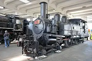 Number 1080 was built by Dübs and Company in 1901 and was rebuilt by the Hamamatsu Works in 1926. It worked local lines (assigned to the Mino-ohta locomotive depot in 1933), until the railway line was shuttered in 1939. 1080 was then used on the Akatani mine railway of the Nittetsu Mining Co. in Niigata Prefecture, starting in 1940 until the mine closed the railway in 1957, where it hauled ore trains and was used to ferry mine workers to and from the site. When the mine railway closed, the locomotive then moved (in 1957) to the Hanezuru mine (also owned by Nittetsu Mining) in Tochigi Prefecture, where it ran until 1979 (the mine itself closed in 1991). It was used as the primary reserve locomotive for the Hanezuru mine's diesel locomotives, hauling mostly limestone trains, until the mine railway closed in 1979.[1] When it arrived at the Museum in 2009, it was mostly complete, still having all valves, gauges and the number plate. A fence was erected around the locomotive for painting and restoration work. It received a coat of rust-resistant paint on the trucks, boiler and safety valve. A new coating was applied to the boiler and preservation work was done in the cabin. Some new gauges were installed, while others simply needed polishing.[3]