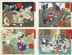 The Kameido Tenjin Shrine was built in Tokyo in 1646. Tokyo was at time a port city of some importance, but was not yet the capital of Japan. Regardless, many people from Tokyo paid homage to Michizane at the shrine between 1646 and 1945. The original Kameido shrine, built out of wood, was destroyed during World War II when the United States Air Force conducted a firebombing campaign against Tokyo; these bombings resulted in the destruction of large parts of the city.[1] In the years after the war, the shrine was rebuilt with more modern materials, such as concrete.[1] The restored shrine is famous for a number of its prominent features; the shrine's grounds contain a number of ponds bridged by drum bridges, and compound also has an abundance of plum trees.[1][2]