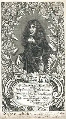 Kaspar von Stieler, also called Caspar Stieler (2 August 1632 – 24 June 1707), was a soldier-poet and later a linguist. He expressed the feelings of the soldiers of the Thirty Years War in his poetry.