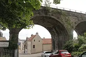 The railway viaduct (solid other than four tall arches) splits the old town of Kinghorn in half.