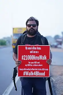 Kiran Verma had founded, Simply Blood for Blood Donation in 2016. He started a walk of 21,000 KM on December 28, 2021, with an aim of making people aware of blood donations.[26] He started from the city of Thiruvananthapuram, Kerala.[27][28][29]