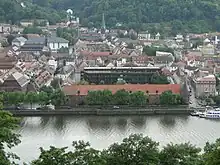 The original settlement of Heidelberg was established on top of the alluvial fan deposited by the Klingenteichbach, which was high enough to protect the settlers when the Neckar flooded. The stream formed the western boundary of the medieval city, with Grabengasse ("cemetery alley") running alongside it. The city was expanded further west in 1392[6] and the stream was covered over. The lion fountain in Universitätsplatz, which draws on its water, once played an important role in the city's water supply.[7][8]