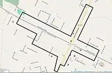 The northern end of the historic district, which encompasses approximately 25 blocks, begins just above the intersection of Hadley Street and North Caswell Street. The boundary heads south, running behind the property lines of buildings along the east side of North Cameron Street. The boundary then heads east, behind buildings facing East Railroad Street and ends before North Carey Street. It then crosses the street and railroad tracks to include buildings on the south side of East Railroad Street. This continues until reaching the properties along South Cameron Street, where the boundary heads south. At East Boundary Street, the boundary crosses the road and heads south for around half a block.[2]