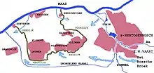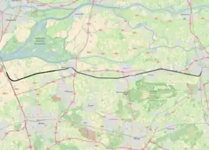 In February 1878 the government then suddenly decided to project the railway north of the Oude Maasje (Bergse Maas did not exist yet). I.e. from Zwaluwe to Heusden and Vlijmen, bypassing the Baardwijk Overflow and the center of the Langstraat.[15] Protests followed immediately. By March 1879, the proposed track had changed again, now to run from Geertruidenberg to Waalwijk to Heusden, and to connect to 's-Hertogenbosch north of the city's railway station.[16] In February 1880 the route of the railway was finally determined almost as it would be built. The only difference was that in Nieuwkuijk it would be directed south, towards Isabella Fortress, thus connecting to 's-Hertogenbosch south of its railway station.[17] In July 1880 the House of Representatives then treated the expropriation law for the railway line.[18]