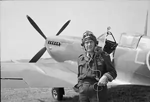 ![]() Air Vice Marshal L O Brown, Air Officer Commanding No. 84 Group, standing by his personal Supermarine Spitfire at Odiham, Hampshire | |