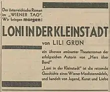- 1 2 Loni in der Kleinstadt. Von Lili Grün. In: Der Tag / Der Wiener Tag, 7. August 1935, p. 12 (online bei ANNO).