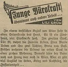 Lili Grün's brother Karl had begun studying law and philosophy in Vienna, was drafted and seriously wounded in the war. Afterwards he could not finish his studies and made his way as a private teacher. On 25 March 1923, he was arrested for attempted counterfeiting.[7] In July 1926, Grete's sister married Hellmuth Bettauer, the son of the writer Hugo Bettauer, who publicly advocated sexual education, impunity for homosexuality, and emancipation of women, and who died in 1925 as a result of an assassination attempt. Hellmuth moved in with Grete to live with Lili Grün in Arnsteingasse, continuing her father's commitment.[8] Grün's contact with Hugo Bettauer and her youth in Red Vienna shaped her later literary work.[9]