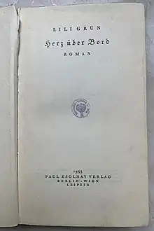 Grün's debut novel Herz über Bord was published by Paul Zsolnay Verlag on 16 March 1933, in an edition of 3,000 copies. The author Robert Neumann had placed the author with the publisher.[30] In it, she processed her experiences that she had gathered as a member of the literary-political cabaret Die Brücke in Berlin in 1931. In the novel, the cabaret collective is called Jazz. The title of the new edition of Alles ist Jazz, published by AvivA Verlag in 2009 under the direction of Anke Heimberg, refers to this. The publisher justified the deviation from the original novel title with title protection.[31]