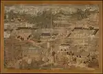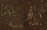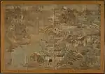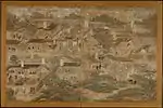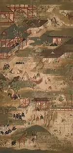 | ICP | King Wen and Lü Shang - Four Sages of Mount Shang, colour on silk 絹本著色文王呂尚・商山四皓図〈/二曲屏風〉 kenpon chakushoku Bunnō Roshō ・Shōzan shikō zu (nikyoku byōbu) | Nanboku-chō period | six two-panel screens; from the west, north, and east walls of the Shariden (舎利殿); shōji remounted as byōbu in the Edo period | ![]() | 147.7 centimetres (58.1 in) by 231.5 centimetres (91.1 in) | N-4 | |