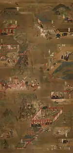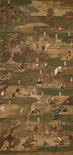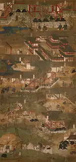 | ICP | Pictorial Biography of Shōtoku Taishi, colour on silk 絹本著色聖徳太子絵伝(法隆寺献納) kenpon chakushoku Shōtoku Taishi e-den (Hōryūji kennō) | 1305 | 4 panels; by Kōzuke Hokkyō (上野法橋) and Tajima Bō (但馬房) | ![]() | 179.0 centimetres (70.5 in) by 85.7 centimetres (33.7 in); 180.0 centimetres (70.9 in) by 86.8 centimetres (34.2 in); 179.0 centimetres (70.5 in) by 86.6 centimetres (34.1 in); 179.0 centimetres (70.5 in) by 85.7 centimetres (33.7 in) | N-2 | |