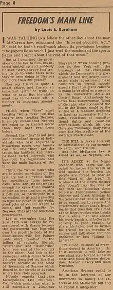 In its initial issue, Burnham wrote an article defending anyone "who is courageous enough to open their mouths, join an organization, sign a petition, or participate in a delegation or attend a meeting to fight for peace in the world, good jobs, decent wages at home, and full equality for Negroes. They are American progressives."[49] An interview with the United Nations ambassador from the People's Republic of China, in the second issue, highlighted another focus of Burnham's in the pages of Freedom, the international anti-colonial struggle. He wrote: [emphasis in original] "the colored people everywhere are conducting their struggles for full human equality."[50]