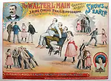 Soon after the Brigg affair, Mattie was advertised with the Walter L. Main Circus in 1894 and billed as "Gaza the strong woman."[28] She was a featured act on a lithographic poster printed to promote her.[29] Part of the advertisement reads: "The Magnetic Wonder a Human Magnet of Strength and Weight the phenomenon of the 19th century, lifting hundreds of pounds of dead weight by just placing her hands on it, twisting bars of iron, resisting as much force as can push on a 12 foot pole by simply placing her hands at one end. It cannot be justly pictured, no words adequate to describe it."