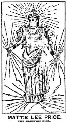 During late 1891 and early 1892, Mattie Lee Price was in Ireland,[16] Scotland,[17] Wales,[18] and England[19] giving demonstrations. Annie Abbott (also known as Dixie Haygood) was also in Europe presenting an almost identical act.[20] Many "magnetic" and "electric" girls were showing off their skills in innumerable locations both in Europe and the North American continent at the time.[21]