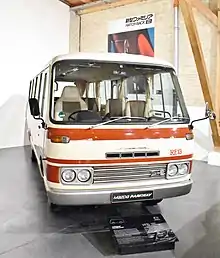 The Mazda Parkway is a minibus that was based on the Mazda Titan platform, and was manufactured at the Hiroshima Factory exclusively for the Japanese market. In 1974, the Parkway was installed with the 13B rotary engine and well as a 2000cc gasoline type "VA" and the diesel 2500cc type "XA". It also offered a novel transmission approach added to the manual transmission installed, called a sub transmission to cope with the load carrying requirements, and a fluid coupling to preventing engine stalling, knocking and oscillation. The rotary-powered minibus was called the Parkway Rotary 26, and could accommodate 26 passengers, even though it weighed 2,835 kg (6,250 lb), and could achieve a maximum speed of 120 km/h (75 mph). It was introduced July 22, 1974 and the rotary engine was replaced with a more conventional diesel engine in 1977.[1][2]