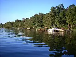 The banks of the lake, which are mostly steep, are largely surrounded by forests. It is one of several lakes known collectively as the heated Konin Lakes because the water temperature is raised as a result of the outflow received from two power stations.[2]