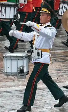 The band's task is purely ceremonial in purpose, with its primary role being to play the State Anthem of Turkmenistan during solemn occasions. It is similar in style to college marching bands in the United States, as well as marching bands located in Russia.[5][6] The massed bands of the military band service are notable for their finale performance at military parades in the capital, in which they work together to form specific shapes and Turkmen symbols.[7]