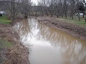 Mill Creek flows generally west-northwestward in a winding course through central and western Jackson County, through the city of Ripley, which may have been named for Harry Ripley, a traveling preacher said to have drowned in the creek in 1830.[9] Downstream of Ripley, the stream passes through a broad valley in the vicinity of the community of Cottageville[10] and flows into the Ohio River at the community of Millwood.[7] Approximately the lowermost 6 miles (9.7 km) of the stream consists of backwater caused by damming of the Ohio.[10] A commercial port facility is located on the creek near its mouth, handling limestone, sand, gravel, aluminum, and salt.[11]