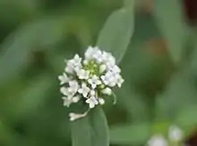 This is a small, dense, mound-forming shrub growing up to 20 centimeters in height. It has many four-angled branches with linear or lance-shaped leaves each 1 to 3 centimeters long. The inflorescence is a rounded head of tiny white flowers.[2]