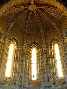 The Monastery of Santa Cruz de Ribas, also called Santa Cruz de la Zarza, is a semi-ruined Spanish monastery of the Premonstratensian order. Located in the low valley of the Carrión River, it is situated between Ribas de Campos and Monzón de Campos, in the region of Tierra de Campos in Province of Palencia, Castile and León. The building was constructed in a transitional style between Romanesque and Gothic (the proto-Romano-Gothic/Cistercian architecture style). The building is indexed in the Spanish heritage register of Bien de Interés Cultural under the reference RI-51-0000811.