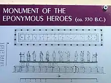 The Monument of the Eponymous Heroes, located in the Ancient Agora of Athens (No. 10 on the map on the right), Greece and adjacently situated near the Metroon (old Bouleuterion, No. 11), was a marble podium that bore the bronze statues of the heroes representing the phylai (tribes) of Athens. The monument was surrounded by a wooden fence on stone posts. All that remains on the modern agora are pieces of a long (over 16 m (52 ft)) statue base with the space for ten statues and two tripods at the ends[1] with partially restored fence. Large size and prominent position make the monument into a landmark for the agora visitors.[2]
