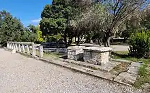 The monument was placed almost parallel to the porch of the Bouleuterion, on the east side a major road that formed the eastern boundary of the market area of agora. The sill of the peribolos, quite well preserved with only few pieces missing, is a rectangle 18.40 m × 3.56 m (60.4 ft × 11.7 ft) in size formed by a course of narrow blocks made of hard light-gray poros stone.[12] The overall construction exhibits a "surprising" lack of precision and regularity, with the peribolos being 12 cm (4.7 in) wider at the north end than at the south one.[12] Only the north end of the sill has any semblance of a foundation, while the rest was placed onto a shallow layer of earth spread across the rough surface packed by the previous intensive traffic. There are no clamps holding the sill blocks together, so the blocks have shifted exposing significant gaps (up to 5 cm (2.0 in)).[13] The ground under the monument slopes down to the north, so the builders tried to set the blocks to compensate for the slope by exposing just 18 cm (7.1 in) of the sill blocks at the south end (as indicated by better dressing of the stone) versus 30 cm (12 in) at the north end. But the sill course is still 7 cm (2.8 in) lower at the north end.[14]