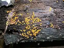 Nectria peziza or yellow spot is an ascomycete fungus with bright yellow to orange globose fruiting bodies (0.2 – 0.4 mm across) found on rotting polypores, well rotted deadwood, bark, dung, and decaying cloth.[1][2] Its globular fruiting bodies (peritheca), quite large for the genus, may be isolated or crowded; they have a slightly prominent black dot at the top, the ostiolum, this being the entrance to the inner cavity;[3] the bodies often collapse into a cup-shape when dry[1] and the colour fades to pale yellow or whitish.