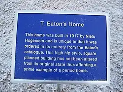 From the early 1900s to the 1930s, Eaton's sold entire houses from their catalogues to help with the population boom throughout Western Canada. The materials were shipped by rail to the nearest community, paid for at the station, and then hauled to the site for construction. Pricing for a home usually cost around $1,577.00 to $2,049.00 from 1917-1918. The total price depended on the extras to be added in. For $146.00 more you could add a "Hot Air Heating Plant" and for $180.00, a complete "Plumbing Outfit". The basement concrete and interior finishing were extra. This made building a home a quick and easier job for the settlers living throughout the prairies, where wood was scarce and supplies were short.
