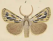 The expansion of the wings of the male is almost 1 1⁄4 inches. The forewings have the costa almost straight, the apex rather acute and the termen obliquely rounded ; bright ochreous with the veins heavily marked in clear white and with black markings between the veins ; a small black spot at the base ; an elongate blotch between vein 1 and the dorsum ; two elongate marks between veins 1 and 2; wedge shaped marks at the origins of veins 2, 3, 4, and 5; a large blotch between veins 5 and 6 ; a much smaller blotch between veins 6 and 7; two obscure elongate marks in disc immediately below middle of costa and two obscure blackish lines between the costal and subcostal veins ; a curved series of subterminal spots and a series of elongate terminal marks. The hind-wings are greyish-brown. The cilia of all the wings are whitish-ochreous. The head is pale brownish-ochreous. The thorax is densely clothed with brownish-ochreous hair with a brown horseshoe-like mark in the middle. The abdomen is pale ochreous. The antennae, which are heavily bipectinated throughout, are reddish-ochreoiis.[2]