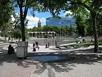 The Olympic Plaza is an urban park and gathering place in downtown Calgary, Alberta, Canada. Located around Macleod Trail and 7 Avenue South, it was created as the venue for the medal ceremonies at the 1988 Winter Olympics.[1] In 2004, over 30,000 people packed the plaza to celebrate the Calgary Flames' run to the 2004 Stanley Cup Finals.[2]