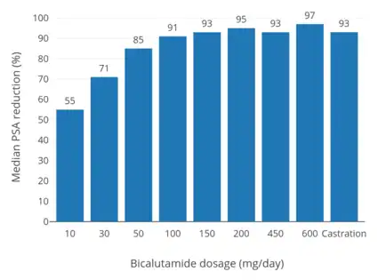 Whereas testosterone is the major circulating androgen, DHT is the major androgen in the prostate gland.[56] DHT levels in circulation are relatively low and only approximately 10% of those of circulating testosterone levels.[56] Conversely, local concentrations of DHT in the prostate gland are 8- to 10-fold higher than circulating levels of DHT.[57][30] This is due to high expression of 5α-reductase in the prostate gland, which very efficiently catalyzes the formation of DHT from testosterone[57] such that over 90% of intraprostatic testosterone is converted into DHT.[58][59] Relative to testosterone, DHT is 2.5- to 10-fold as potent as an AR agonist in bioassays, and hence, is a much stronger androgen in comparison.[60] As such, AR signaling is exceptionally high in the prostate gland, and the effectiveness of bicalutamide monotherapy in the treatment of prostate cancer, which is roughly equivalent to that of gonadotropin-releasing hormone analogues (GnRH analogues),[61][47][62][63] demonstrates a capacity of bicalutamide to strongly antagonize the AR. On the other hand, GnRH analogue monotherapy achieves only a 50 to 60% reduction in levels of DHT in the prostate gland,[24][64] and combined androgen blockade (CAB), the combination of surgical castration or a GnRH analogue and bicalutamide, is significantly more effective than either modality alone in the treatment of prostate cancer.[21][65] Bicalutamide monotherapy has been found to decrease circulating levels of prostate-specific antigen (PSA), a marker of prostate cancer growth, by 57% at 10 mg/day, 73% at 30 mg/day, 90% at 50 mg/day, 97% at 100 mg/day, and 97% at 150 mg/day, while a 97% reduction in PSA is observed with 50 mg/day bicalutamide as a part of CAB.[24] It has also been reported that bicalutamide monotherapy decreases median circulating levels of PSA at 3 months by 86.7% at 100 mg/day, 91.1% at 150 mg/day, and 93.8% at 200 mg/day (relative to 94–97% for castration).[55] Above a bicalutamide monotherapy dosage of 200 mg/day, up to 600 mg/day, decreases in PSA levels reach a plateau.[33][55] In a study of very-high-dose bicalutamide monotherapy, decreases in PSA levels after 12 weeks were approximately 93% with 300 mg/day, 96% with 450 mg/day, 96% with 600 mg/day, and 96% with castration.[66]