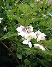 Philadelphus purpurascens is a deciduous shrub native to Yunnan and Sichuan in southwestern China, growing in mixed forests, thickets and on mountain slopes.
